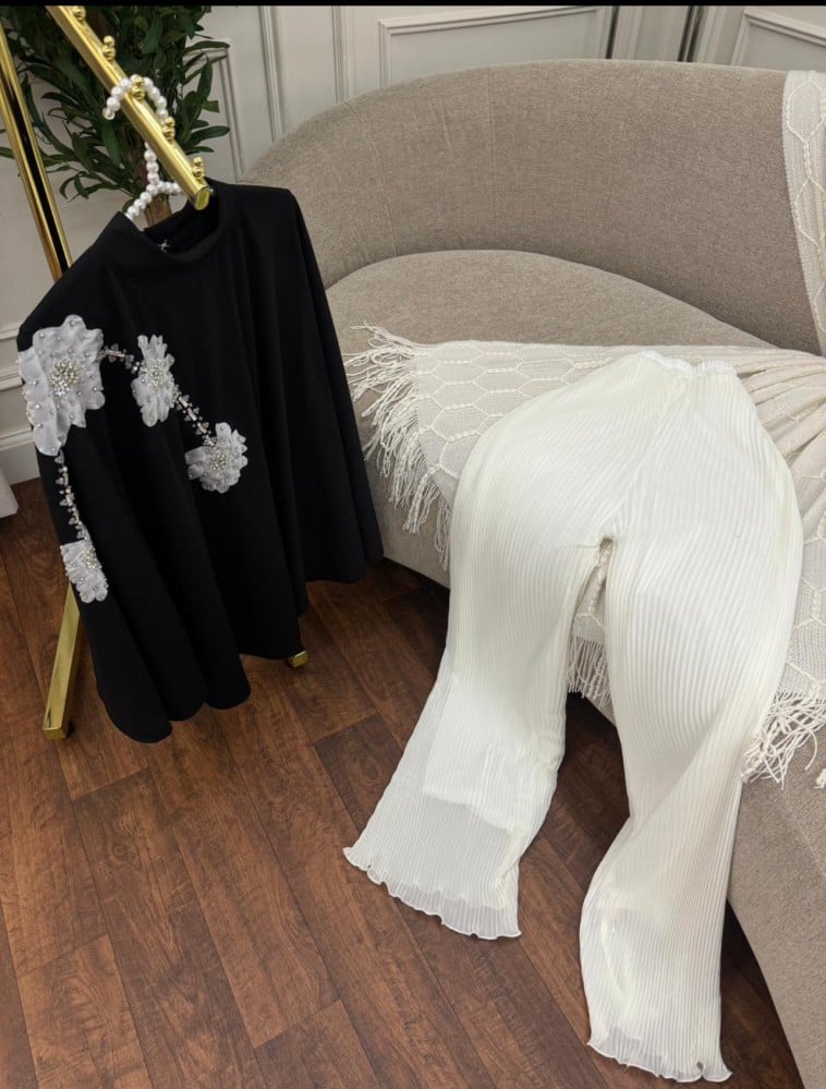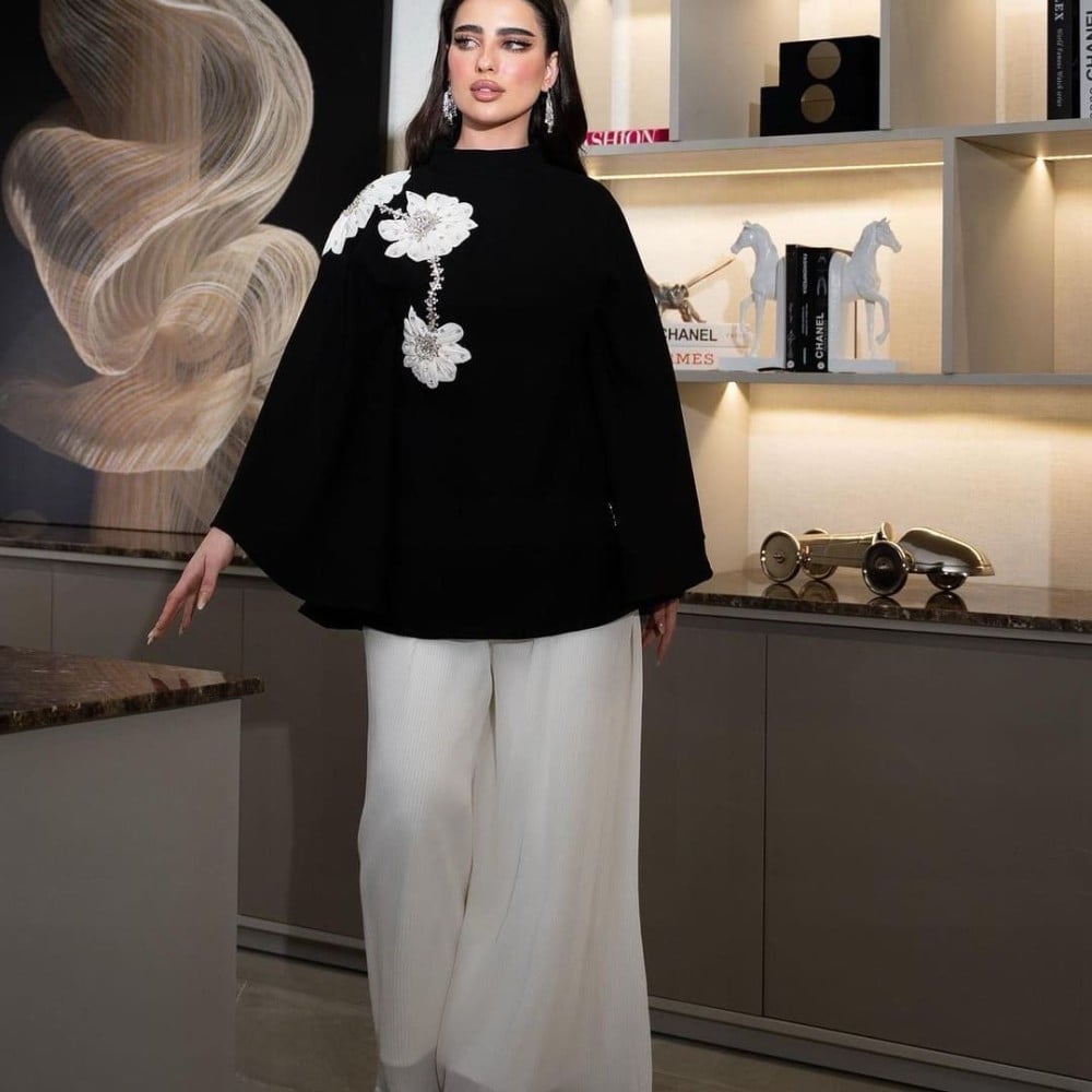 بدلة العيد الرائعة مكونة من قطعتين باللونين الأسود والأبيض. هذه البدلة مصممة بأناقة وذوق عالي، مما يجعلها مثالية ومناسبة لشهر رمضان وعيد الفطر أو أي مناسبة أخرى.