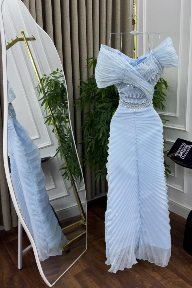 فستان سهرة سماوي خامة بيلسيه مكسر