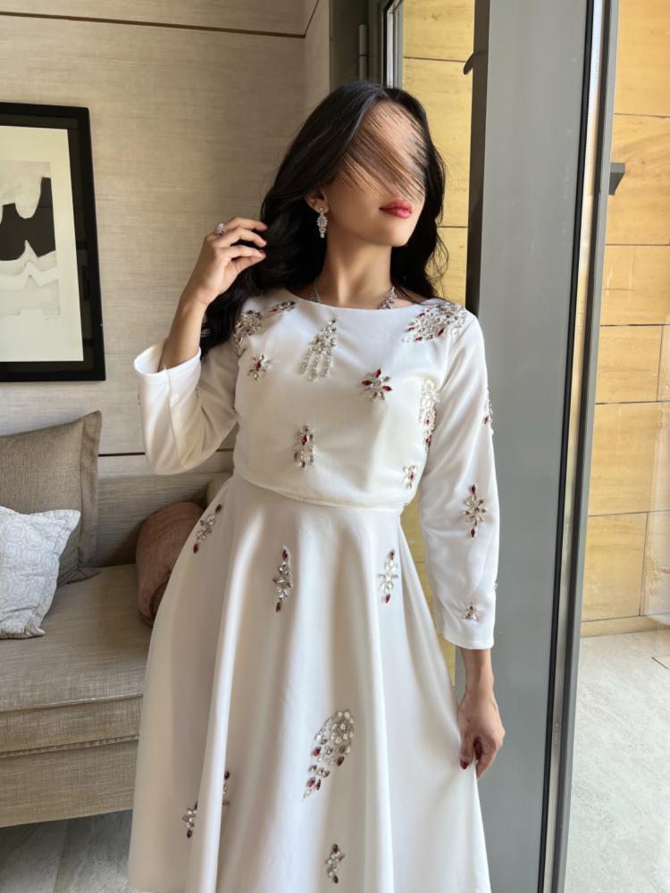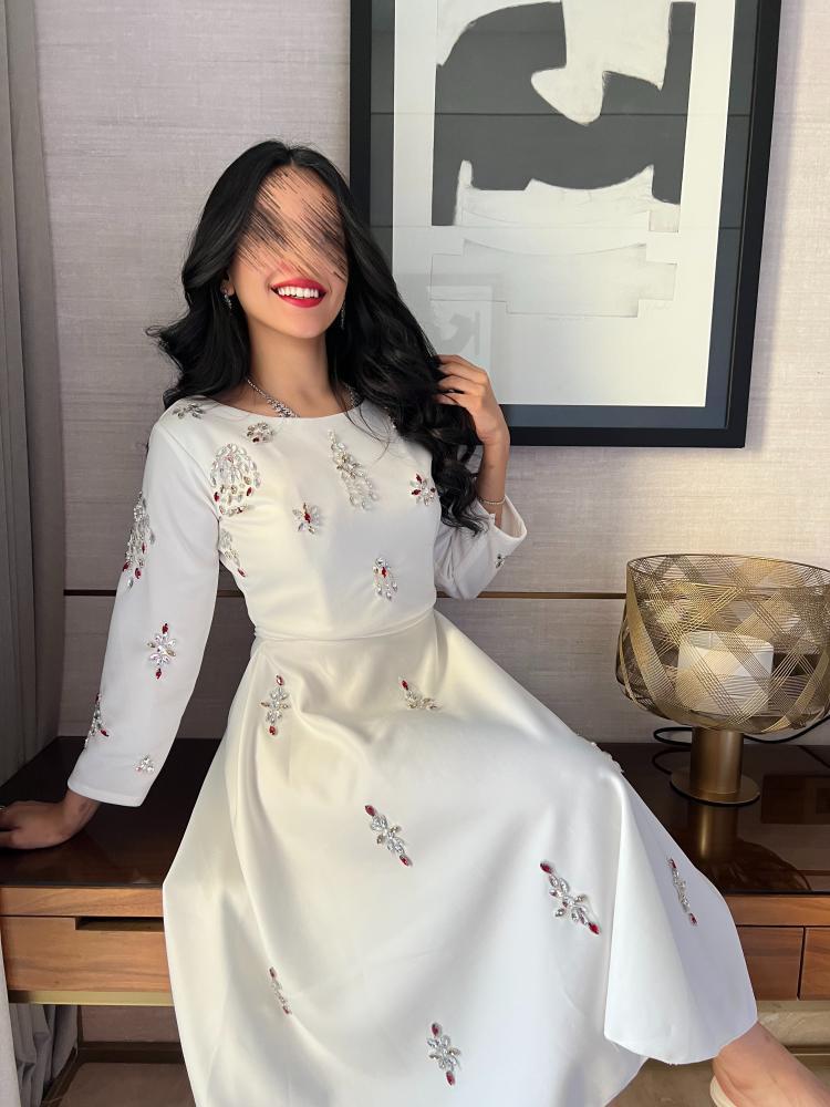 تألقي مع فستان العيد الانيق بتصميم عصري حيث يجسد هذا الفستان الأناقة و التميز في كل تفاصيله مصنوع من خامات عالية الجودة يأتي الفستان باللون الابيض الناصع و تطريز كريستالات الفاخرة يتمتع القماش المستخدم بملمس ناعم و خفيف مما يجعله مريح في الارتداء لفترة طويلة