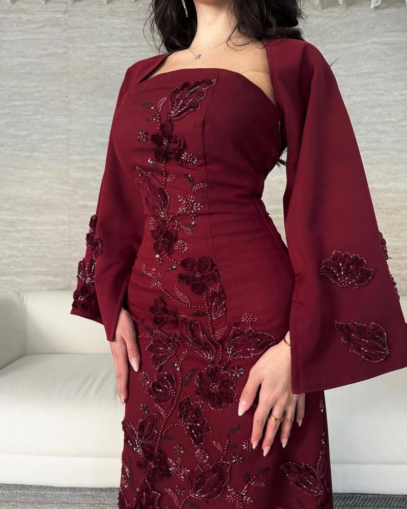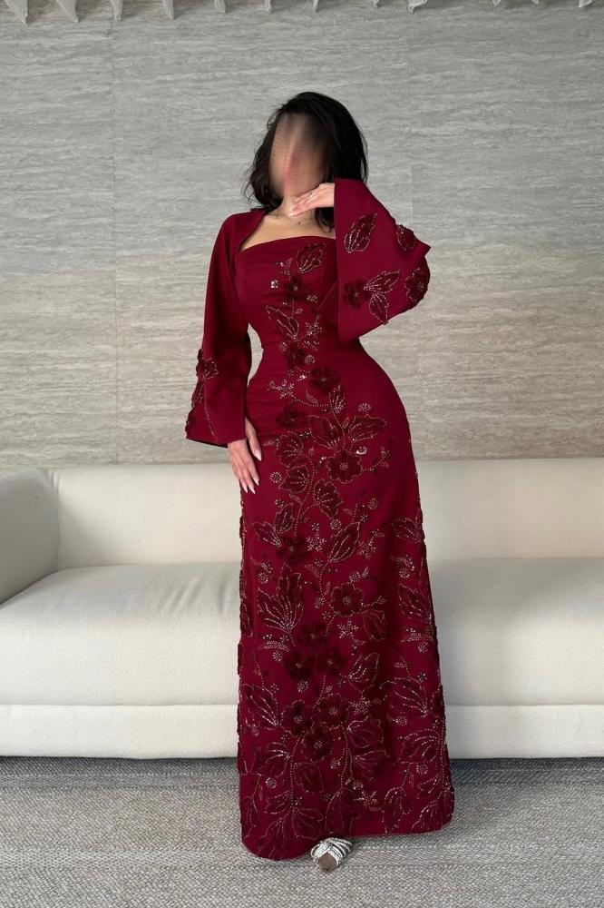 فستان العيد باللون الهبة مطرز بورود نطريز يدوي