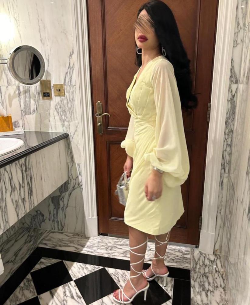 فستان ميدي ناعم بلون أصفر قصير وأنيق