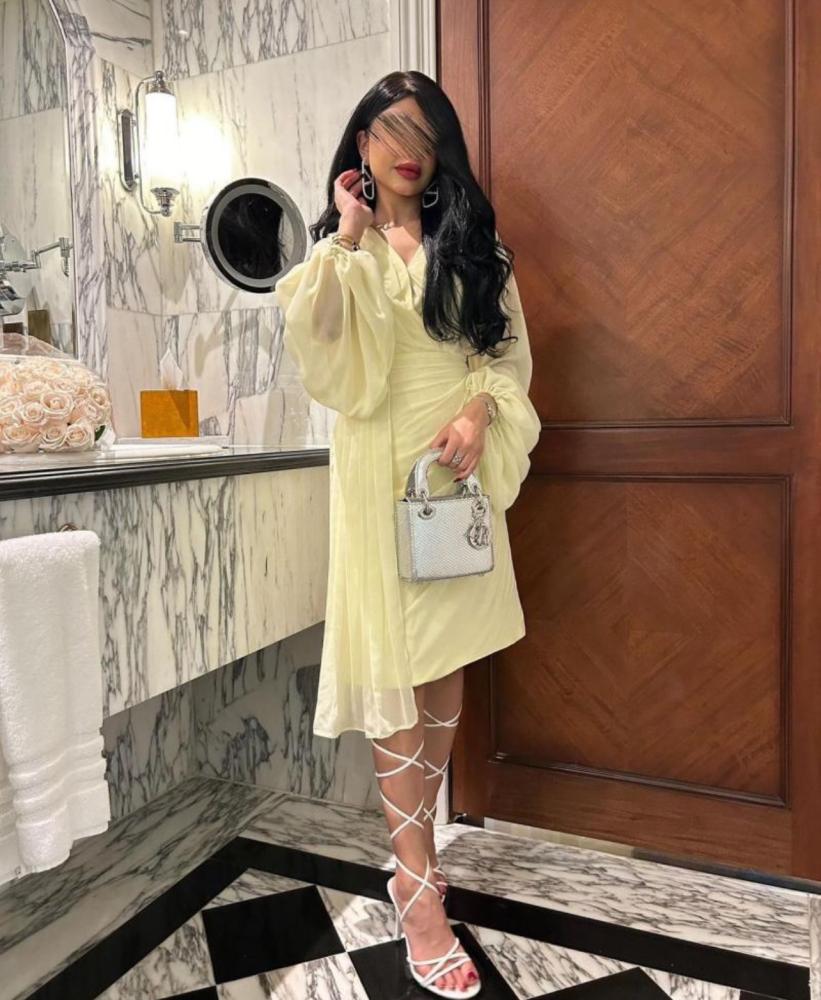 تصميم الفستان باللون الأصفر الزاهي يجعله مثاليًا لفصل الصيف، حيث يتناسب تمامًا مع أشعة الشمس الدافئة والأجواء المشرقة. بفضل اللون الأصفر الزاهي، ستضفين لمسة من الإشراق والحيوية على إطلالتك.