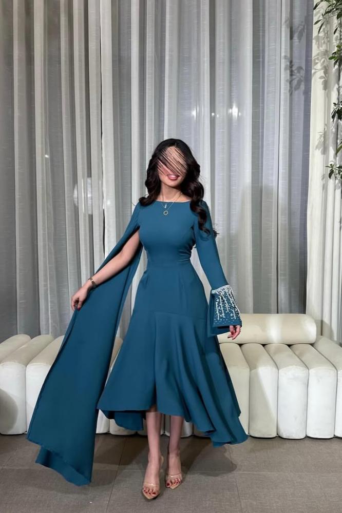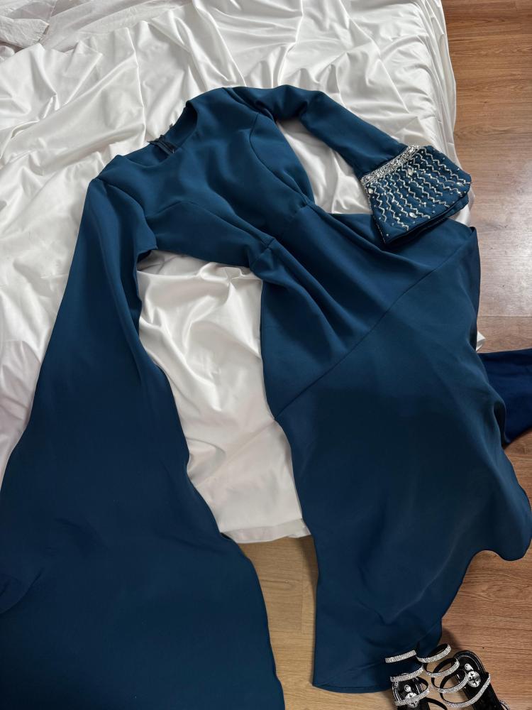 فستان بترولي بكم مطرز