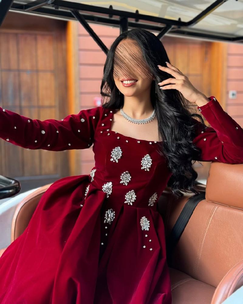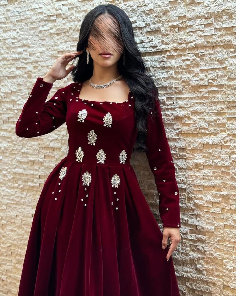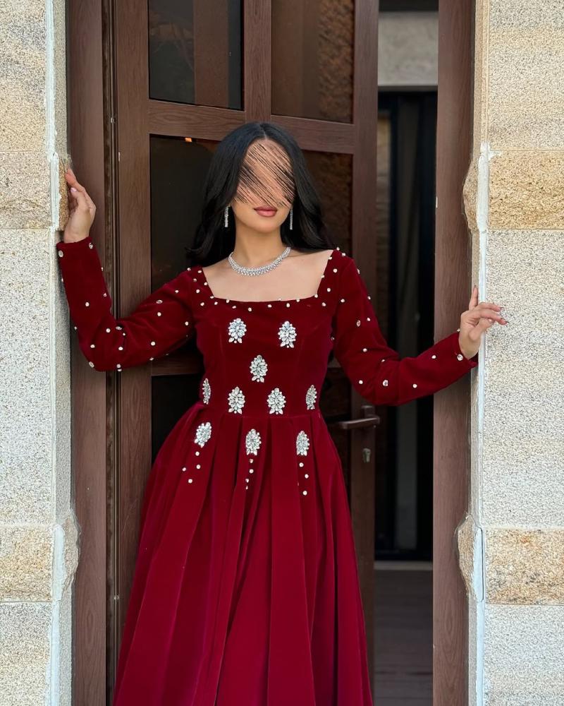 فستان مخملي أنيق بأكمام طويلة ولون خمري، مصنوع من قماش مخمل ثقيل عالي الجودة. هذا الفستان المذهل يأتي بتصميم يجمع بين الأناقة والأنوثة، مما يجعله خيارًا مثاليًا لفصل الشتاء .