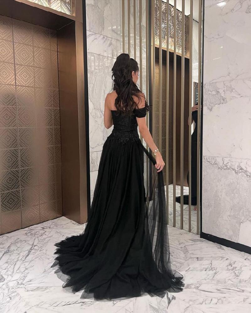 فستان اسود عاري الاكتاف بفتحة عند الساف