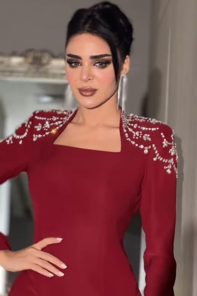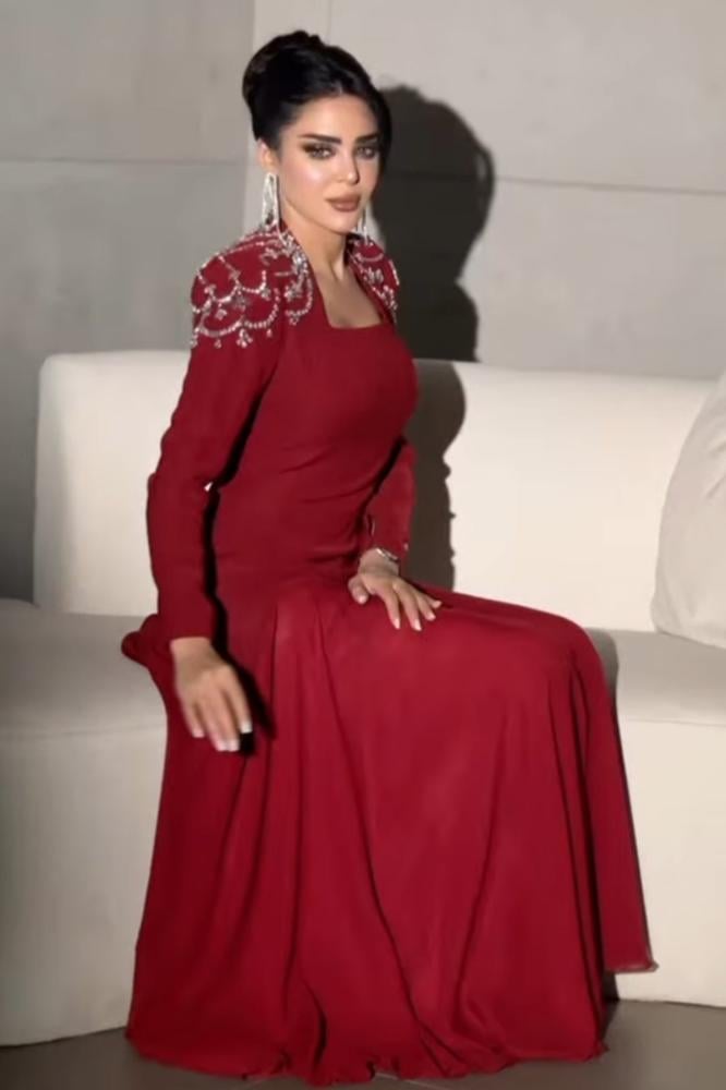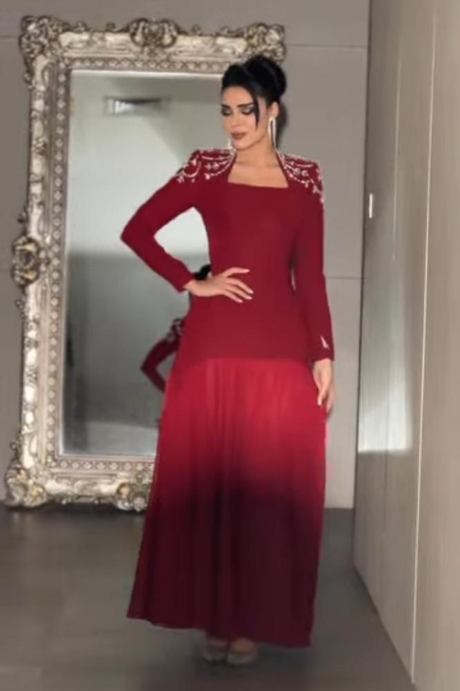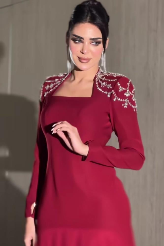 فستان برغندي مطرز الاكتاف