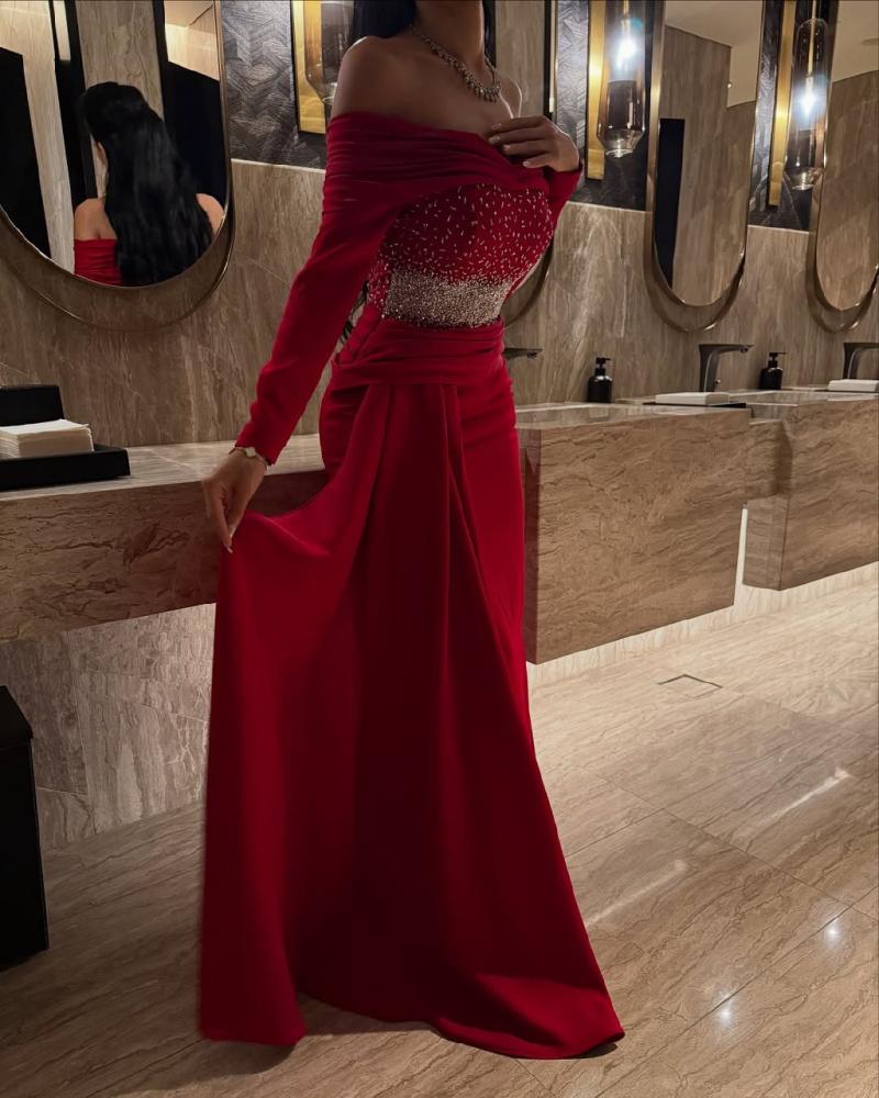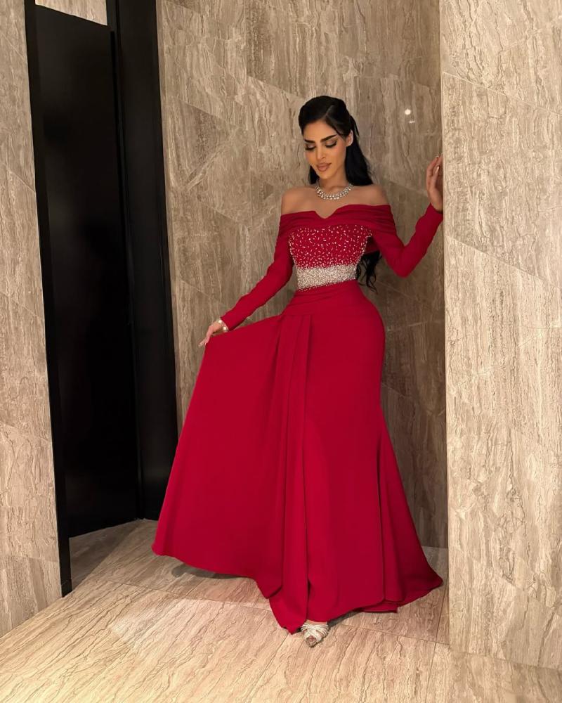 فستان احمر تطريز عالخصر راقي