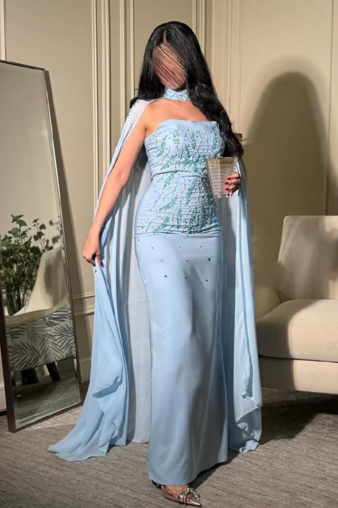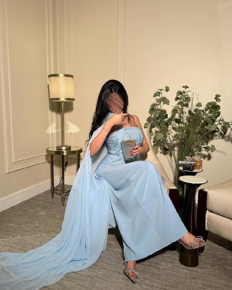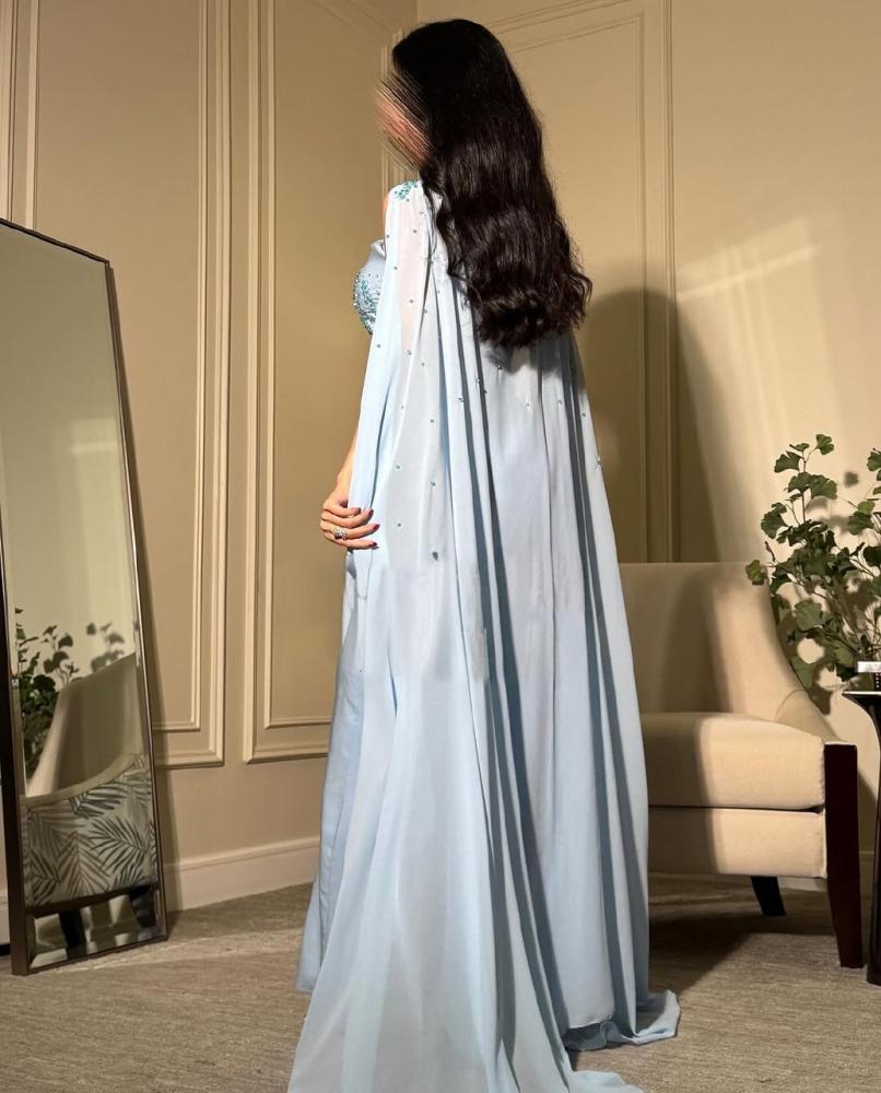 فستان سماوي خامة باربي مع شيفون مطرز بكرستال