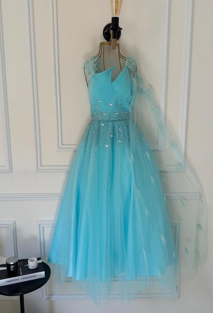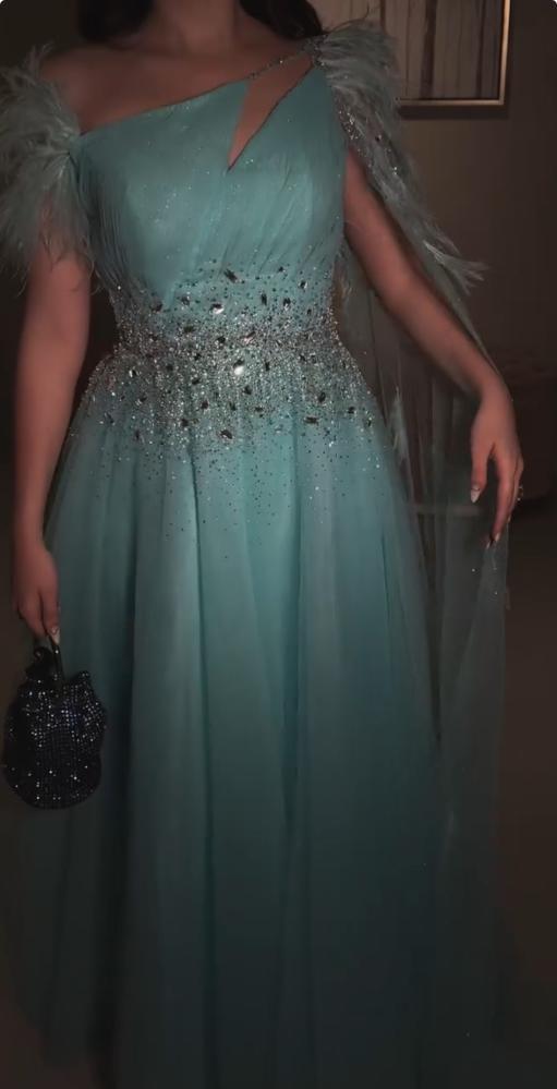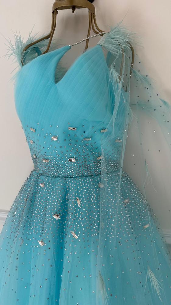 فستان سهرة تركواز خامة تل الرائع يجسد أناقة وجمال الأمواج البحرية. تصميمه الأنيق والمذهل يتألق بلون تركوازي ساحر يجذب الأنظار ويضفي لمسة من السحر والجاذبية على من يرتديه.