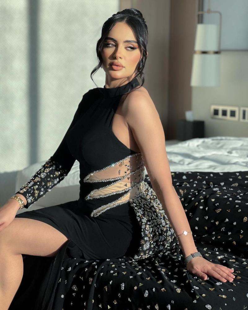 فستان سهرة تطريز يدوي باللون الأسود، تصميم رائع يجمع بين الأناقة والجرأة. مصنوع يدويًا بأقمشة عالية الجودة تتميز بتفاصيل تطريز دقيقة ومتقنة تضفي لمسة فنية على الفستان.