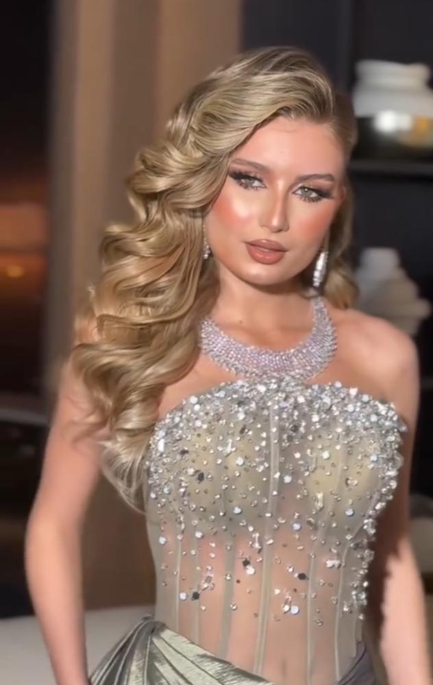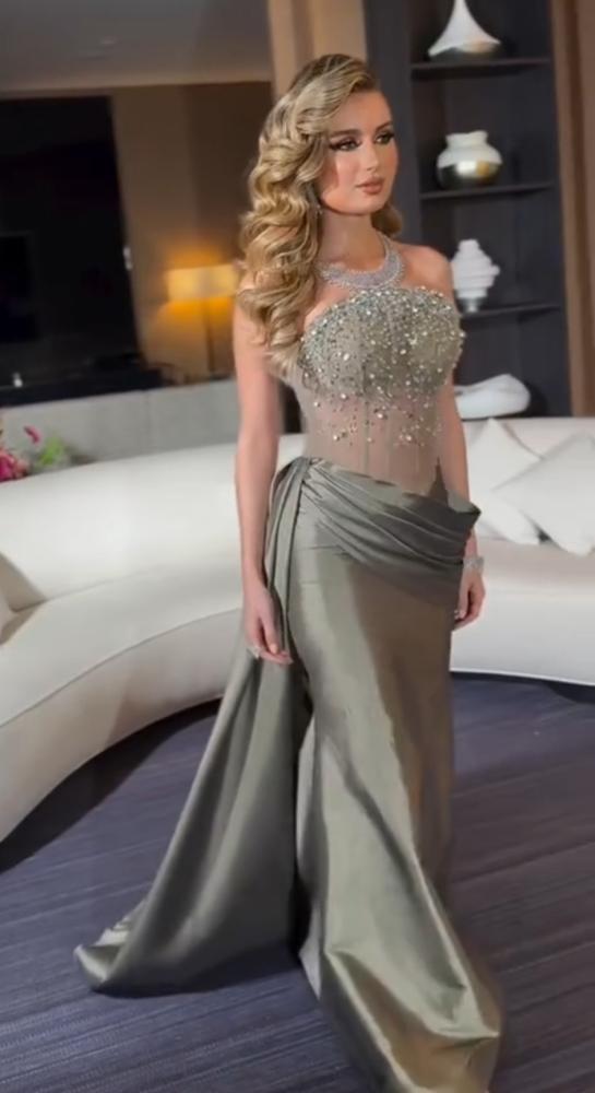 فستان سهرة زيتي فخم خامة تفتة مع تطريز كريستال