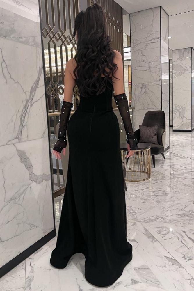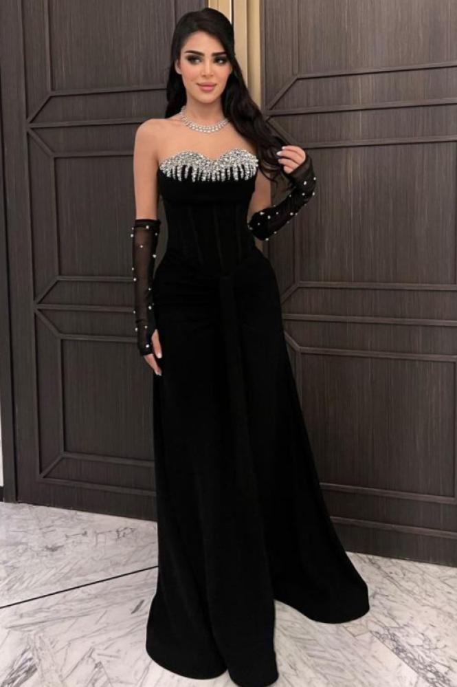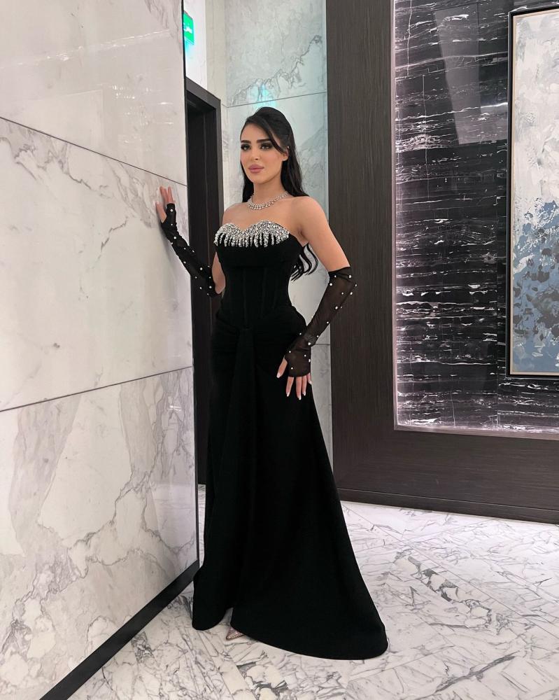 فستان مخمل مطرز باللون الأسود مصمم بأناقة، يعكس أناقة وفخامة المرأة التي ترتديه. تم تصميم هذا الفستان من قماش مخمل مطرز بأرقى التفاصيل، مما يجعله قطعة فريدة ومميزة في خزانة ملابسك.
