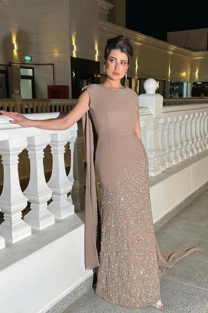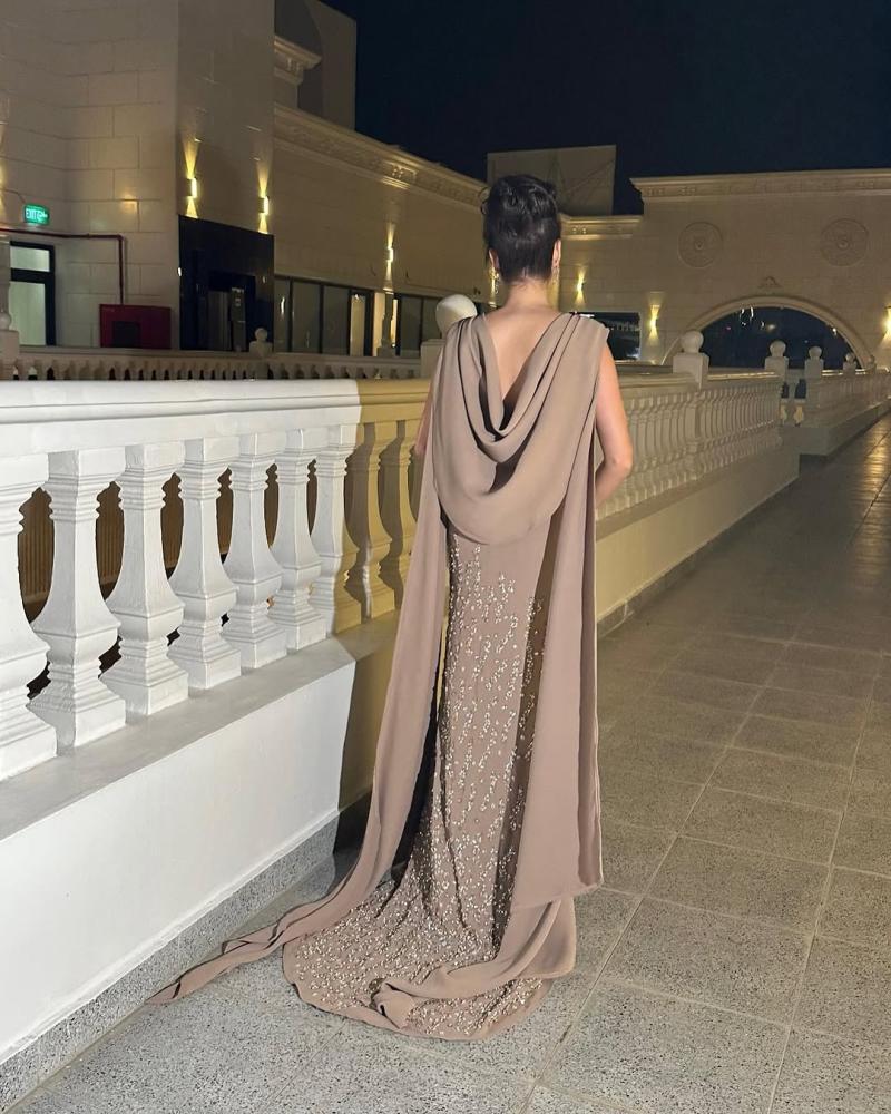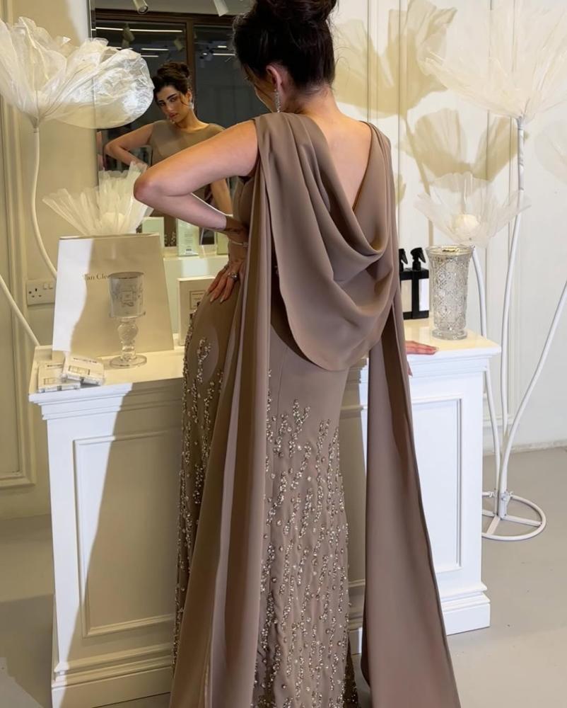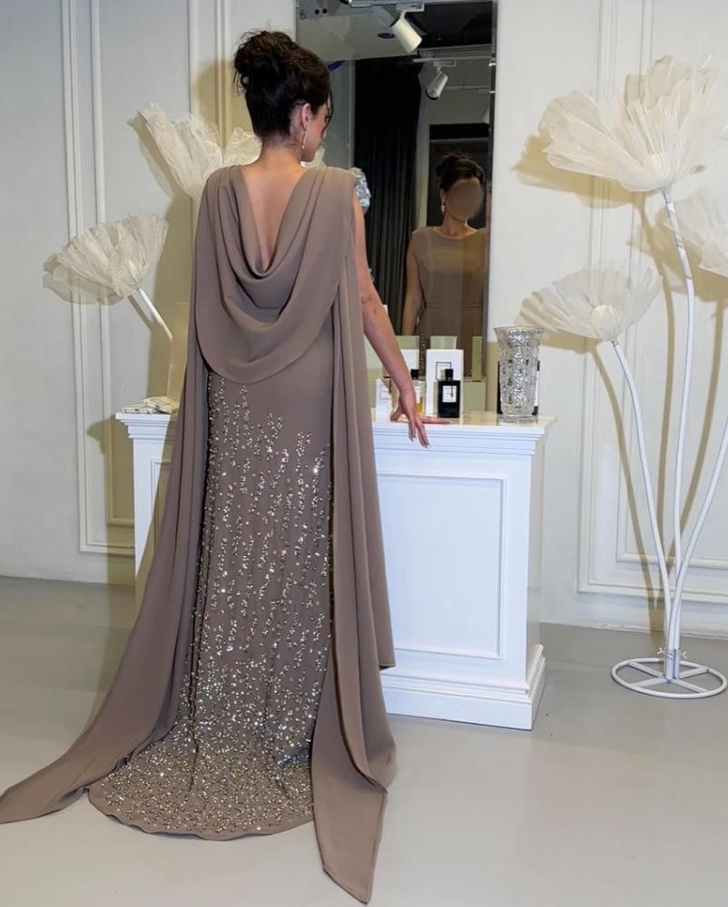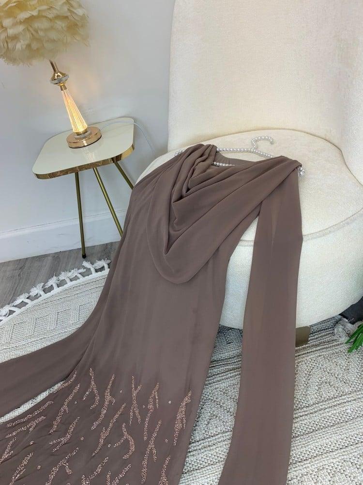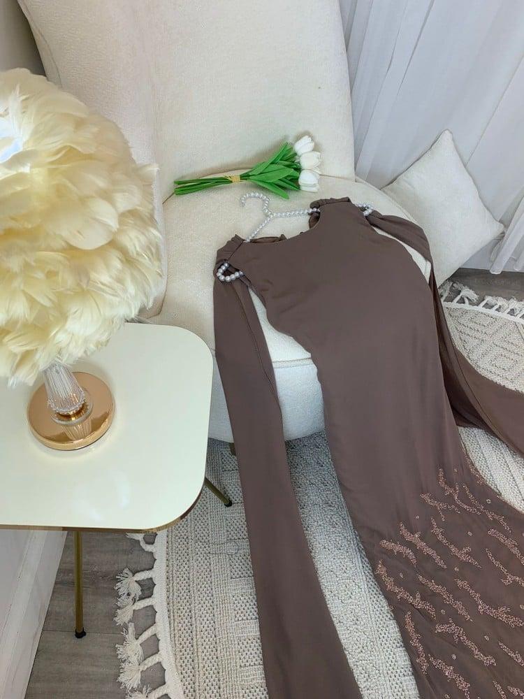 فستان موكا خامة شيفون بتطريز كريستال اصلي